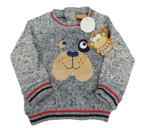 Nové - tmavomodro-bílo-šedo-černá melírovaná chlupato/pletená mikina s pejskem Cheeky Chimp
