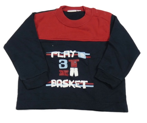 Tmavomodro-červená mikina s nápisem a oblečením