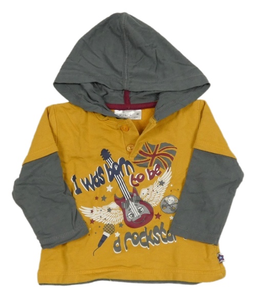 Hořčicovo-tmavošedá mikina s kytarou a vlajkou a nápisy a kapucí