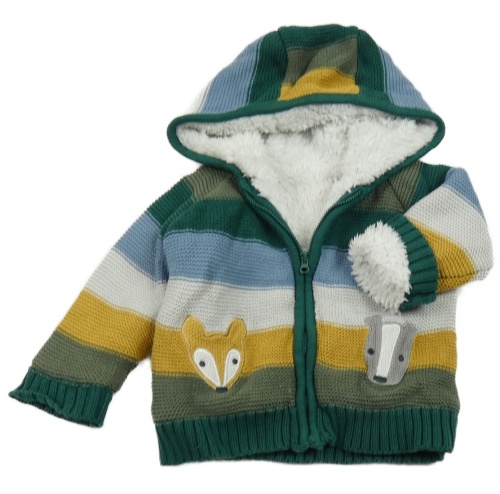 Barevný pruhovaný propínací zateplený svetr se zvířátky a kapucí Nutmeg