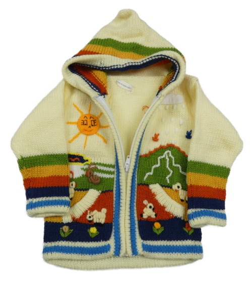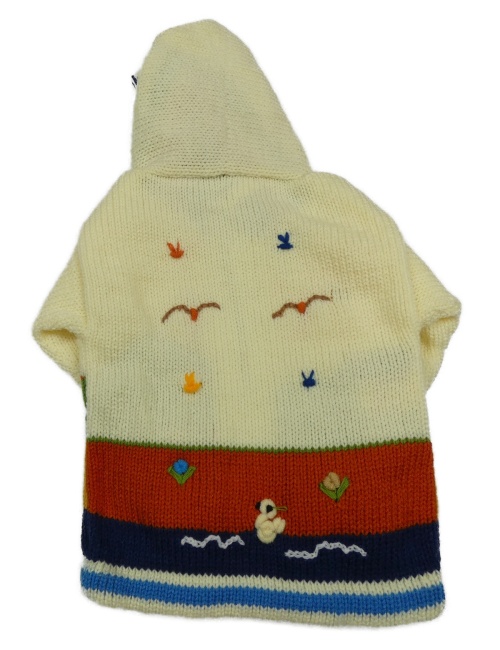Vanilkovo-barevný propínací svetr s obrázky a kapucí
