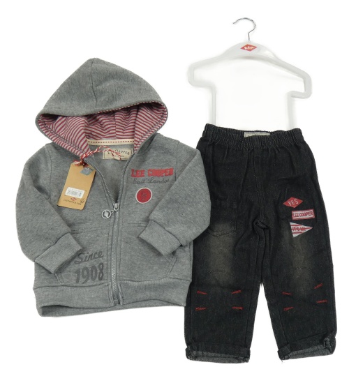 Nové - 2set- šedá propínací mikina s logem a kapucí+ černé rifle s potiskem Lee Cooper