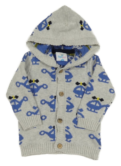 Světlešedý melírovaný propínací svetr s vrtulníky a kapucí Topomini
