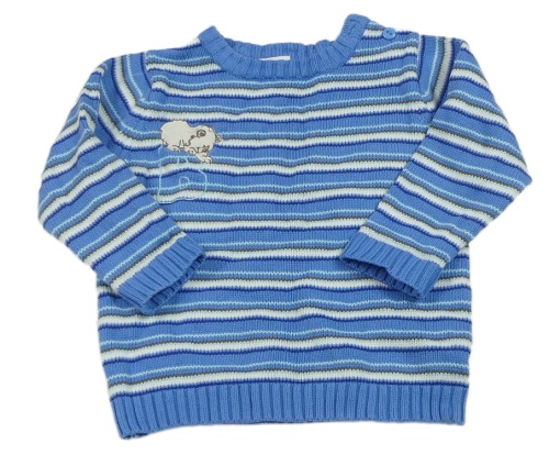 Modro-bílo-hnědý pruhovaný svetr s medvědem