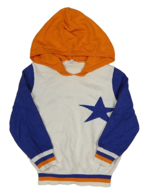 Bílo-safírovo-oranžový úpletový svetr s hvězdičkami a pruhy a kapucí
