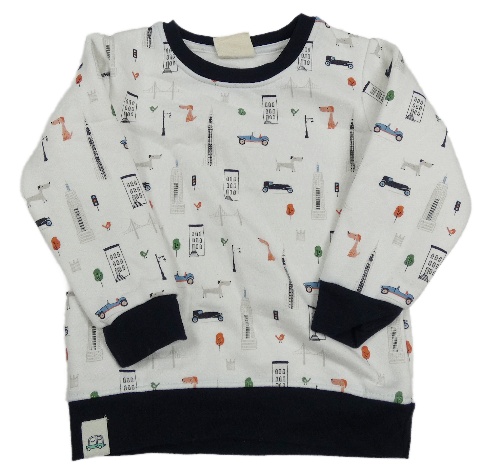 Bílo-tmavomodrá teplá mikina s pejsky a auty a budovami