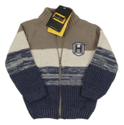 Nové -tmavomodro-bílo-hnědošedý melírovaný žebrovaný pletený propínací svetr s nášivkou HASHTAG