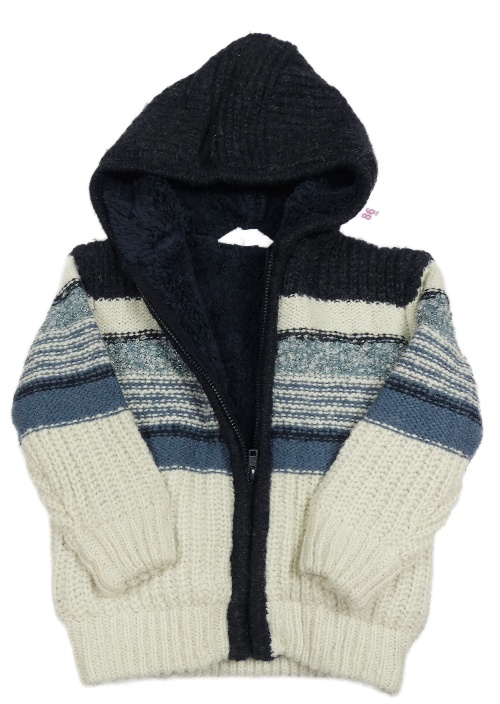 Nový - smetanovo-modrošedo-černý žebrovaný vlněný propínací zateplený svetr s kapucí Primark