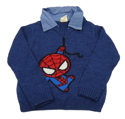Tmavomodrý svetr se Spidermanem a košilovým límcem