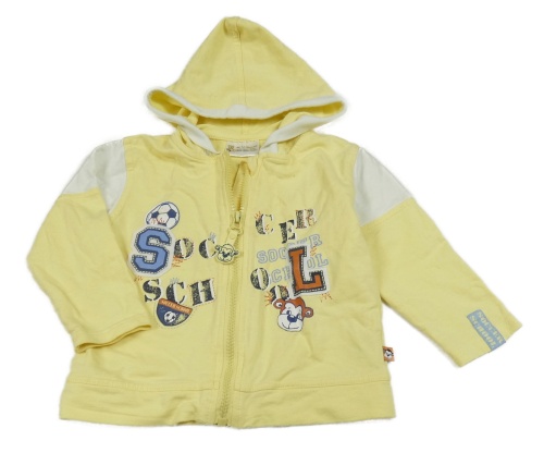 Žluto-bílá propínací mikina s nápisem a kapucí