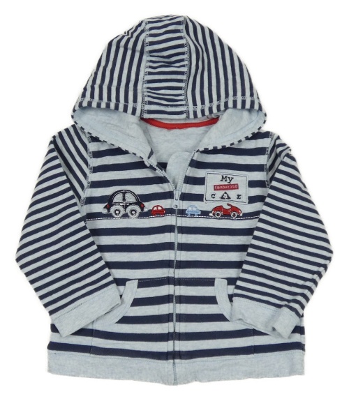 Tmavomodro-světlemodrá pruhovaná propínací mikina s auty a kapucí George