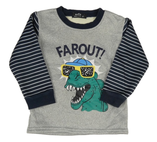 Šedo-tmavomdro-bílá melírovaná pruhovaná teplá mikina s dinosaurem