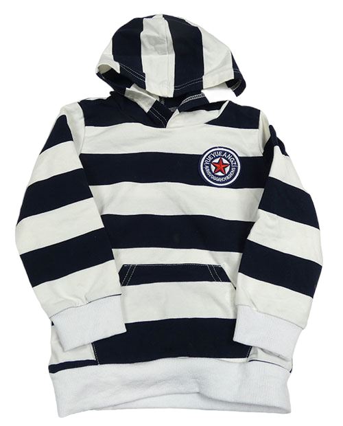 Bílo-tmavomodrá pruhovaná mikina s nášivkou a kapsou a kapucí