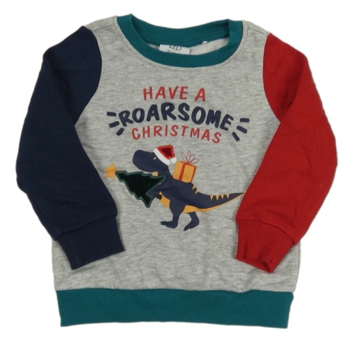 Šedo-červeno-tmavomodrá vánoční mikina s dinosaurem L&D