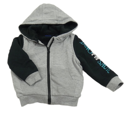 Šedo-černá zateplená propínací mikina s nápisem a dinem a kapucí Lupilu
