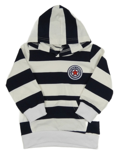 Bílo-tmavomodrá pruhovaná lehká mikina s nášivkou a kapucí