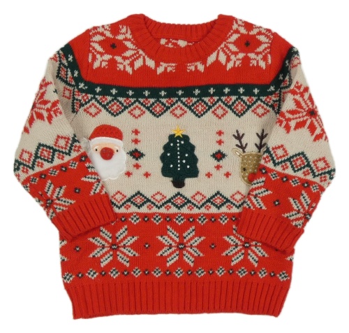 Červeno-smetanový vzorovaný vánoční svetr se Santou a stromečkem a sobem George