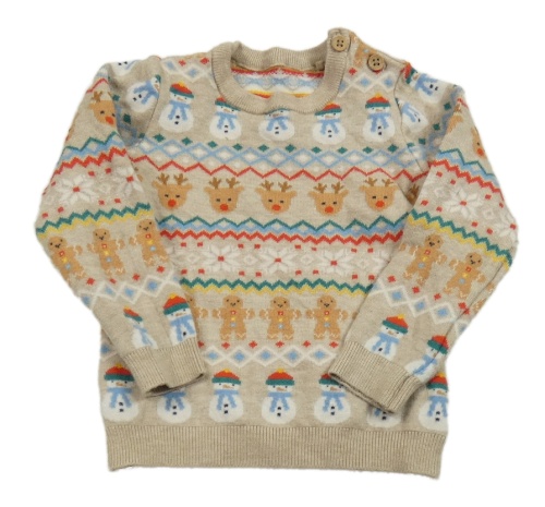 Béžový vzorovaný svetr s perníčky a sněhuláčky a soby Tu