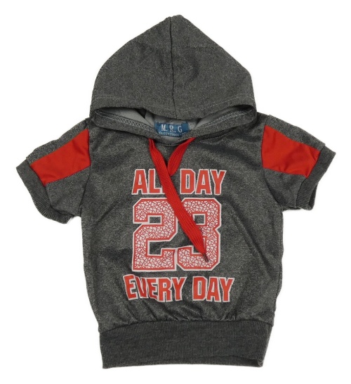 Šedo-červená tepláková vesta s nápisem a kapjucí