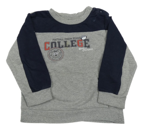 Šedo-tmavomodrá mikina s nápisem a kočkou