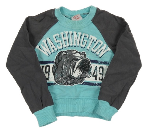 Azurovo-tmavošedá mikina s buldokem a číslem a nápisem