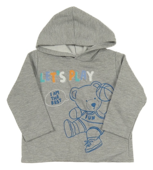 Šedá melírovaná mikina s medvídkem a nápisy a kapucí