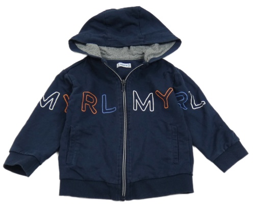 Tmavomodrá propínací mikina s nápisem a kapucí Mayoral