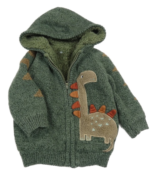 Tmavozelený melírovaný propínací zateplený svetr s dinosaurem a kapucí Nutmeg