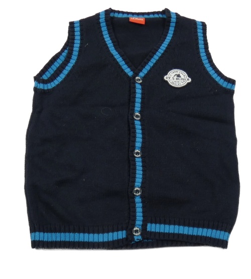 Tmavomodro-modrá propínací svetrová vesta s nášivkou S. Oliver