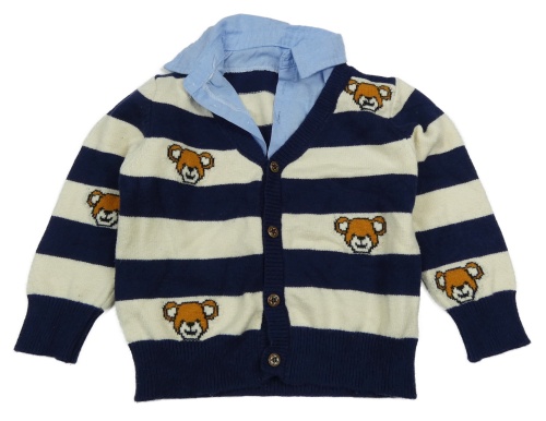 Smetanovo-tmavomodrý pruhovaný propínací svetr s medvídky a košilovým límcem