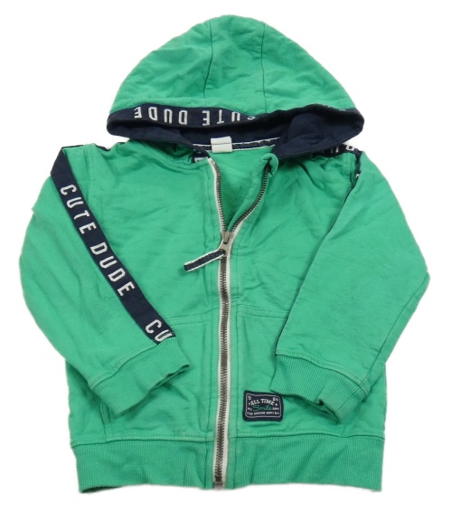 Zelená propínací mikina s pruhy na rukávech s nápisy a kapucí