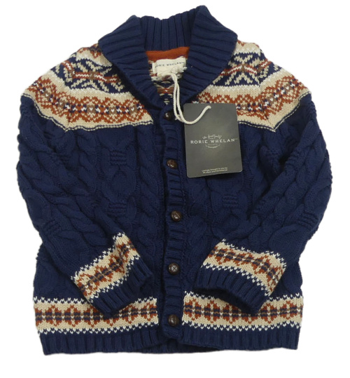 Nové- Tmavomodro-béžovo-oranžový vzorovaný propínací svetr