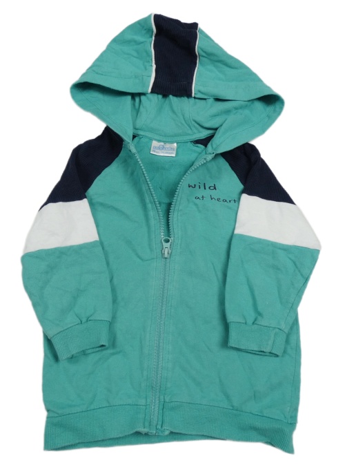 Zeleno-tmavomodro-bílá propínací mikina s nápisem a kapucí