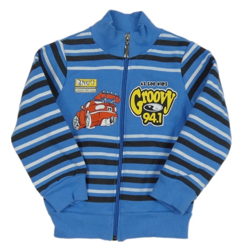 Modro-černo-bílá pruhovaná propínací mikina s autem a nápisem