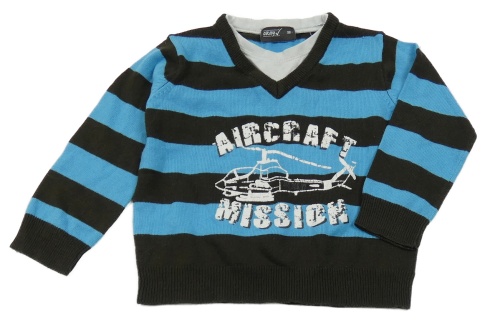 Hnědo-modrý pruhovaný svetr s vrtulníkem