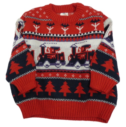 Červeno-bílo-tmavomodrý vzorovaný vlněný svetr s vláčky