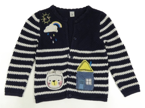 Tmavomodro-bílý pruhovaný propínací svetr s obrázky Tu