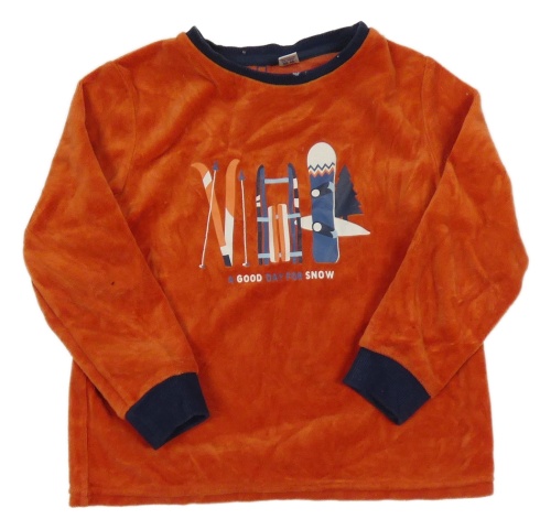 Tmavooranžovo/tmavomodrá sametová pyžamová mikina s lyžemi a saněmi a snowboardem OKaïdi