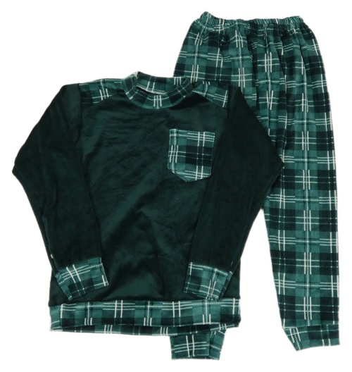 Tmavozeleno-bílé plyšové pyžamo s kapsou