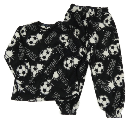 Černé plyšové pyžamo s míči a nápisy a bílými skvrnkami