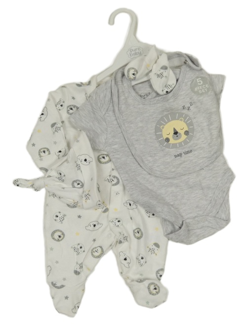 Nové - 5set - Bílý overal se zvířátky + bílá čepička + rukavice + šedé body s lvíčkem + šedý bryndák
