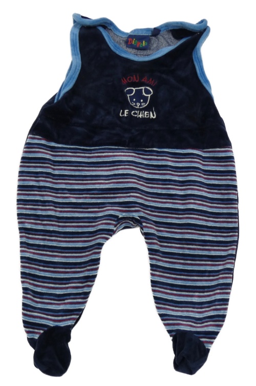 Tmavomodro-pruhovano-modré sametové dupačky s myškou a nápisy