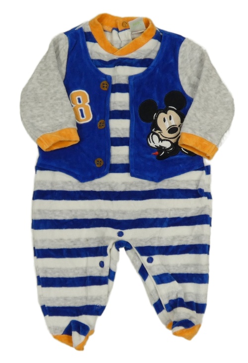 Šedo-modro-bílý pruhovaný sametový overal s Mickeym a sakem Disney