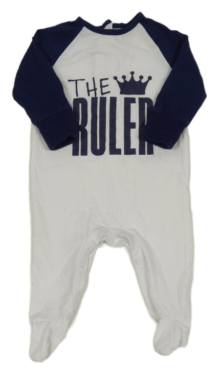 Bílo-tmavomodrý overal s nápisem a korunou Matalan