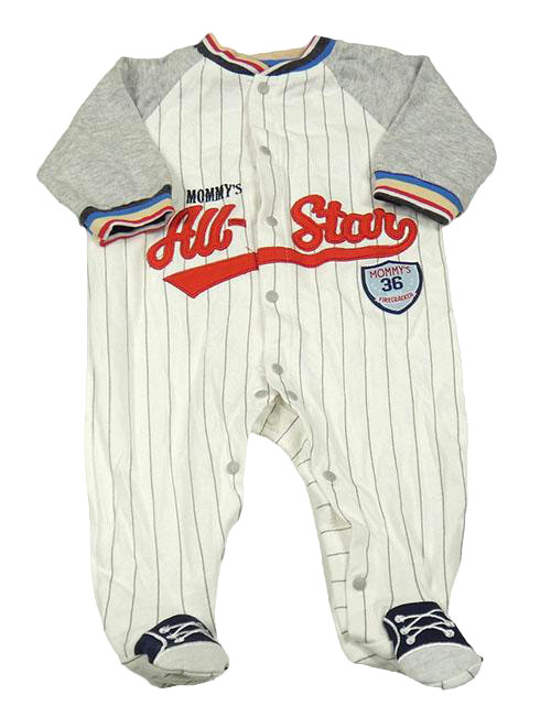 Bílo-šedý pruhovaný overal s nápisem a nášivkou