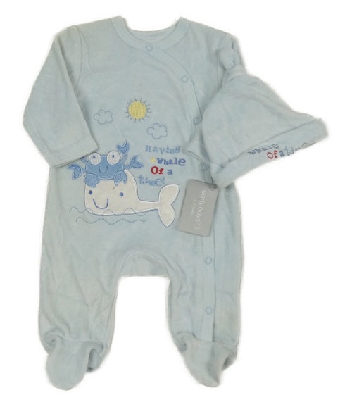 2set- Nové- modrý sametový overal s obrázkem+ čepice Early Days