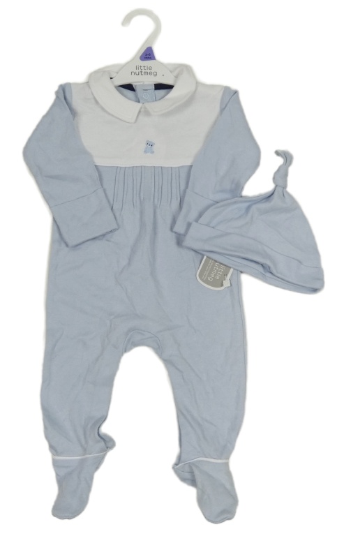 Nové - 2set - Světlemodro-bílý overal s medvědem a límečkem + bavlněná čepice Nutmeg