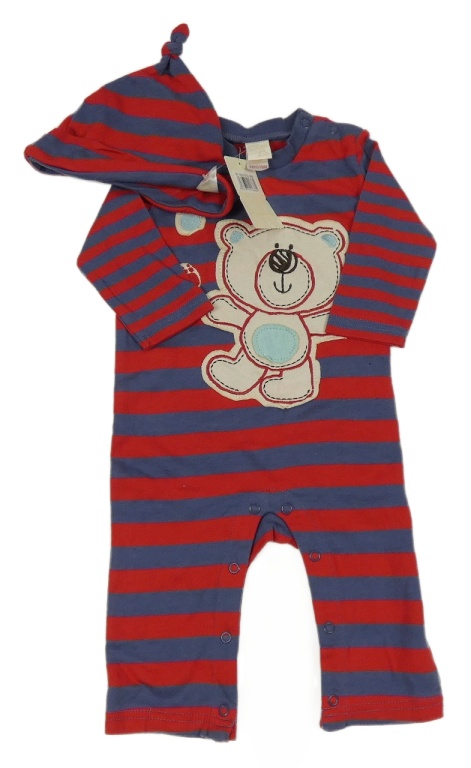 Nové - 2set - Tmavomodro-červený pruhovaný overal s medvídkem + čepice