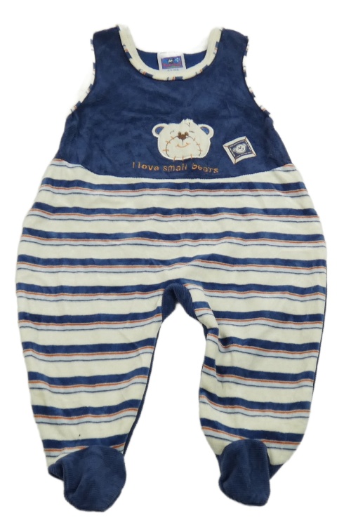 Tmavomodro-bílo-modro-rezavé pruhované sametové dupačky s medvídkem Topolino