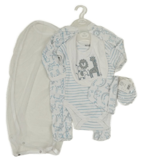 Nové - 5 set - bílo-modrý overal s dinosaury + pruhované body + bryndák + čepice + rukavice